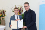 Wissenschaftsminister Bernd Sibler überreicht Prof. Dr. Beck-Meuth die Ernennungsurkunde zur Präsidentin der Hochschule Aschaffenburg und übergibt ein Dankesschreiben an den scheidenden Präsidenten Prof. Dr. Diwischek (Foto: HAW Aschaffenburg)
