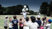 Die Jugend kickt und liest: Anpfiff des „Lese-Kick“ an der Grundschule an der Walliser Straße in München mit Kunstminister Blume (© Axel König/StMWK)
