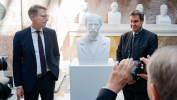 „Revolutionär der Physik zieht in bayerischen Olymp des Erinnerns ein“ – Markus Söder und Kunstminister Markus Blume bei Büstenaufstellung von Max Planck (©StMWK/Axel König)