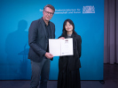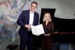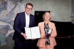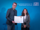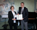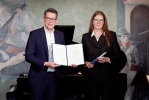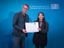 Kunstminister Markus Blume verleiht die Auszeichnung PRO MERITIS SCIENTIAE ET LITTERARUM an Prof. Julia Fischer (© Axel König/StMWK)