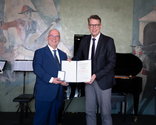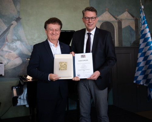Staatsminister Markus Blume zeichnet Gründungsvater von Universitätsmedizin Bayern e.V. Prof. Dr. Matthias Frosch mit dem PRO MERITIS SCIENTIAE ET LITTERARUM aus (© StMWK/Axel König)